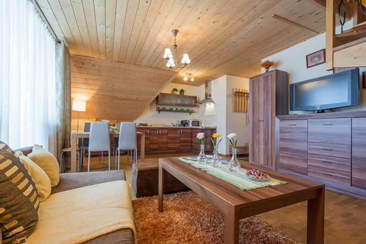 POD-SMERKIEM asunto - Epäilemättä tämä on täydellinen maalaismainen vuoristohuoneisto 6 km:n päässä Zakopanesta - täydellinen lasten vanhemmille. Puulattiat ja -seinät, terävät vinot (pyramidin hyödyllisten ja uudistavien ominaisuuksien vaikutus), kaksi erittäin tilavaa kerrosta yhdistävät portaat ja lopuksi upeat näkymät Länsi-Tatralle. Lähistöllä laskettelurinteitä hiihtohisseillä ja lämpöaltailla Chochołowskie Termy ja uima-altaat Szymoszkowassa.