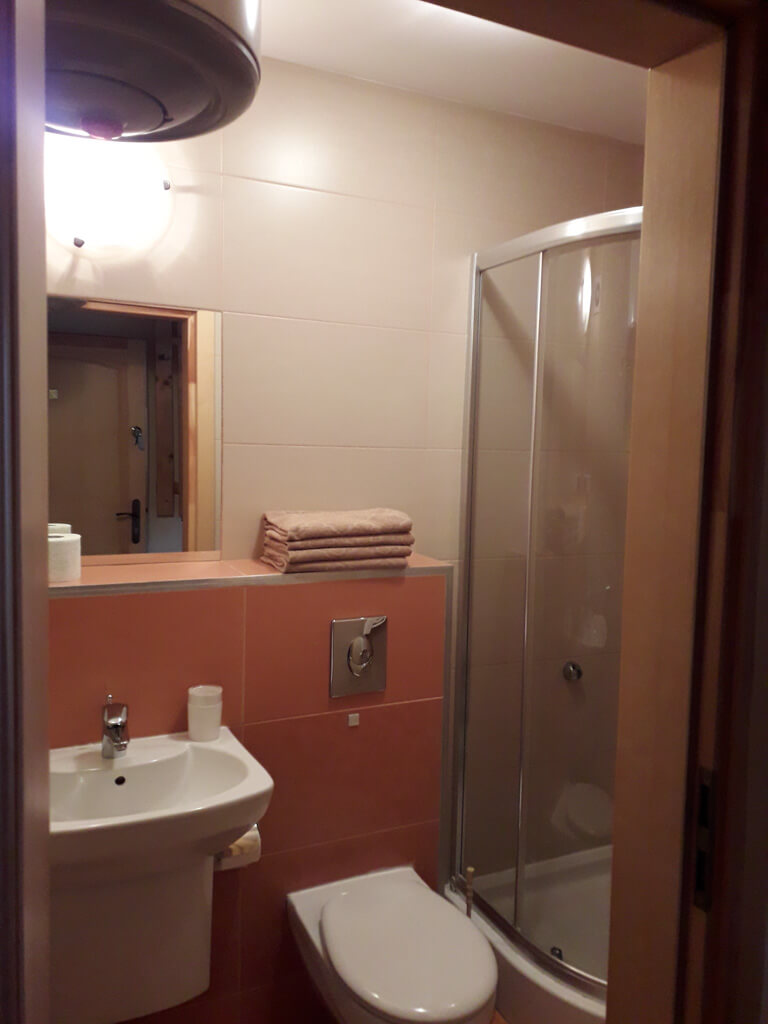 suihkukaappi, pesuallas, wc, hiustenkuivaaja, pyyhkeet, lattialämmitys